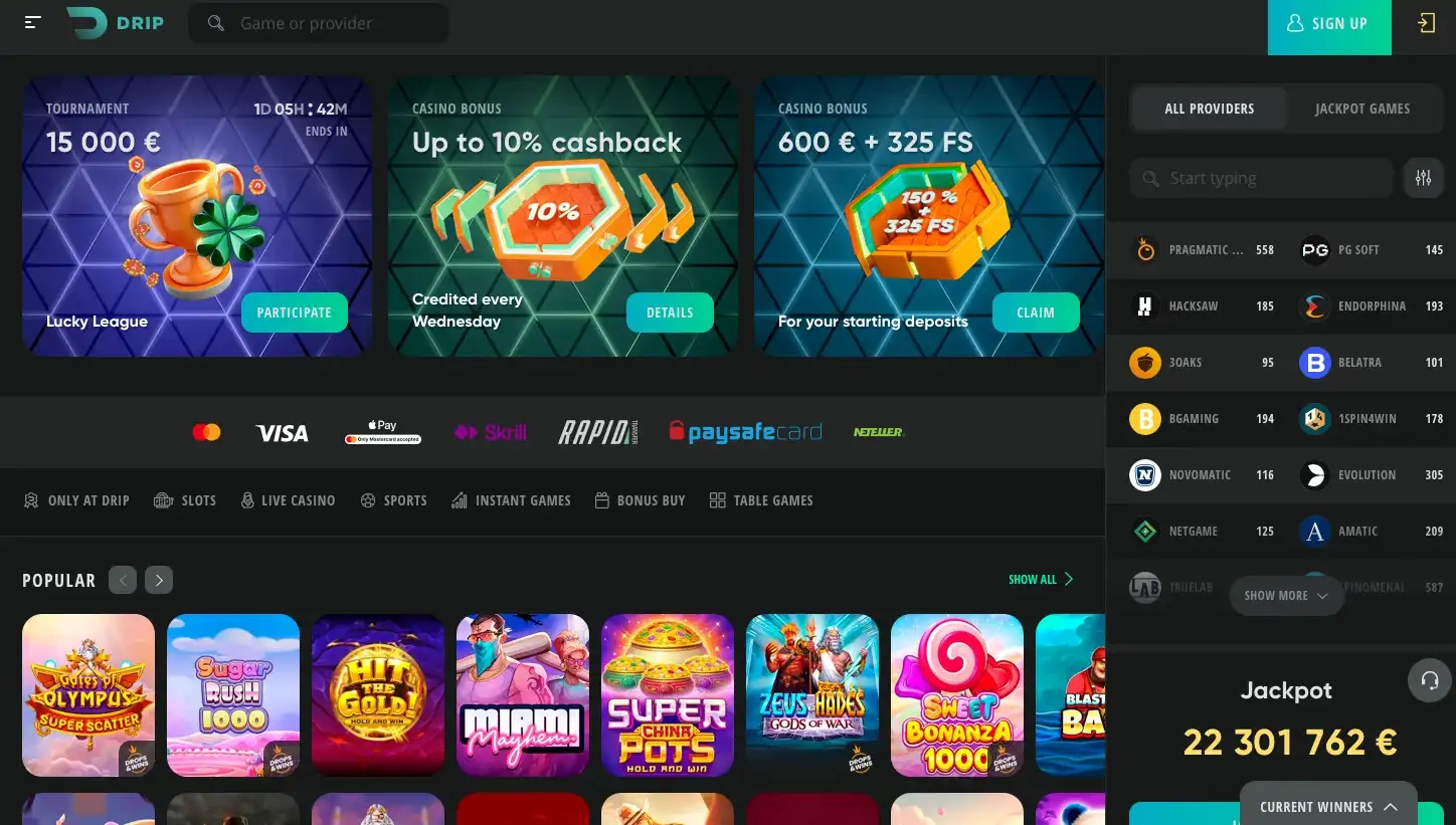 un e-sporta derības. Šajā rakstā sniegsim detalizētu Drip Casino apskatu, aptverot tā funkcijas, bonusus, drošību, maksājumu metodes un citas būtiskas nianses, lai palīdzētu jums izlemt, vai šis kazino ir piemērots jūsu izklaides vajadzībām.